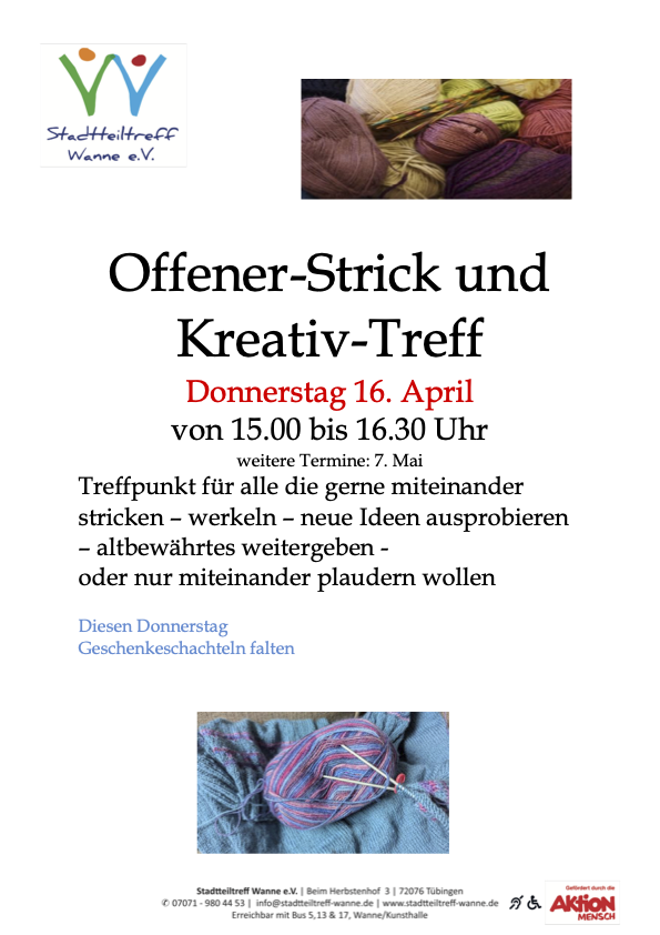 Wir laden Sie herzlich zu den vielfältigen Veranstaltungen unseres Stadtteiltreffs ein! Sie finden hier den Veranstaltungskalender und hier das Programm für April 2026 als PDF-Datei.